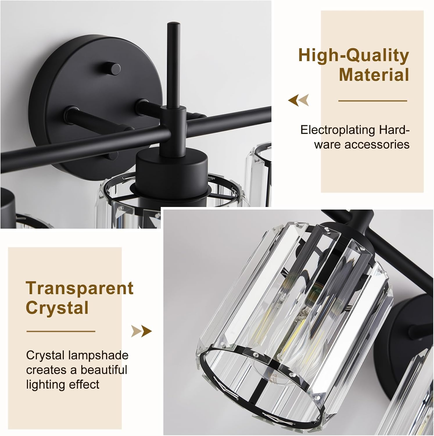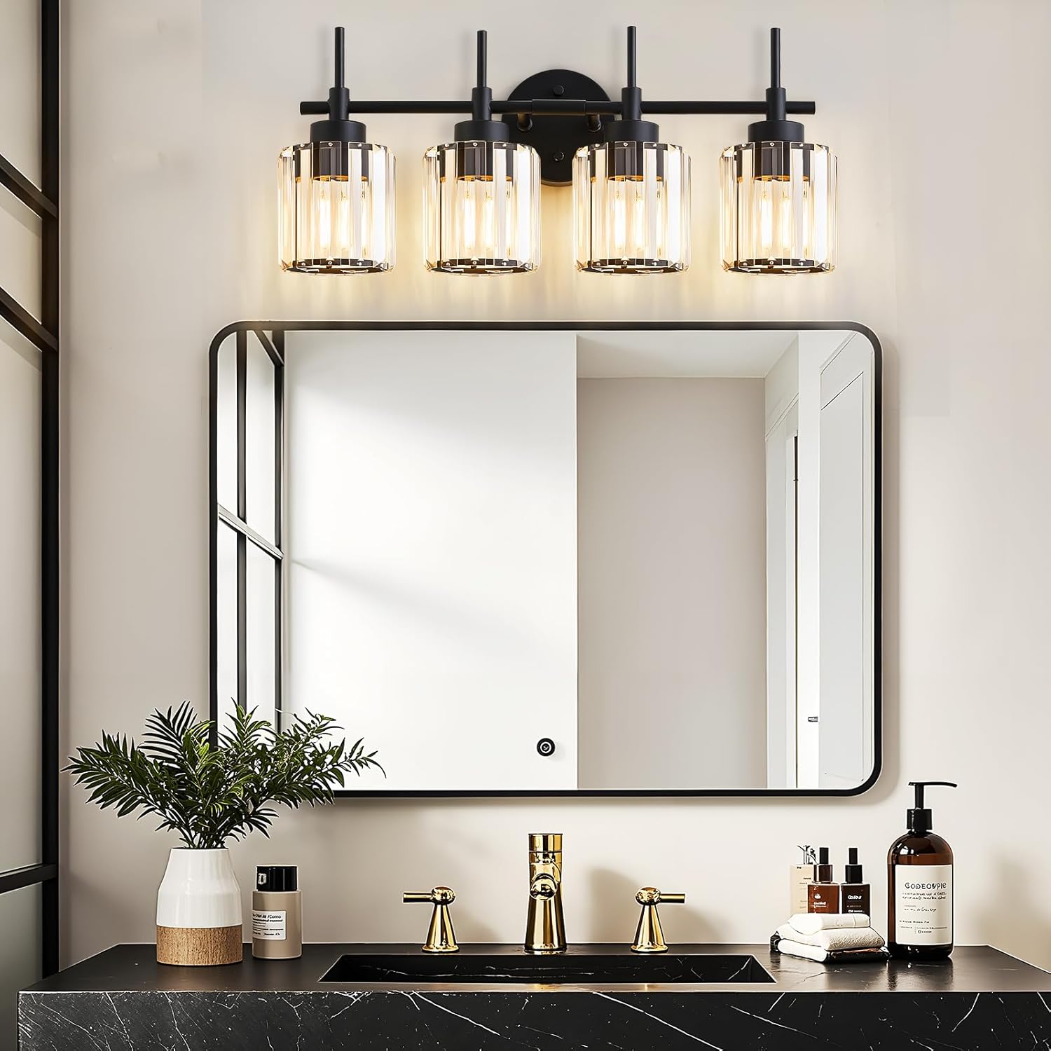 - Crystal Vanity Light Fixture: 4 light bathroom vanity light special Featuring a metal structure and high-quality crystal cover with special cutting. It is bright and romantic, can create a beautiful lighting effect. The thick clear glass shades emit a beautiful glow, creating a pleasant lighting atmosphere outside your home or inside your room