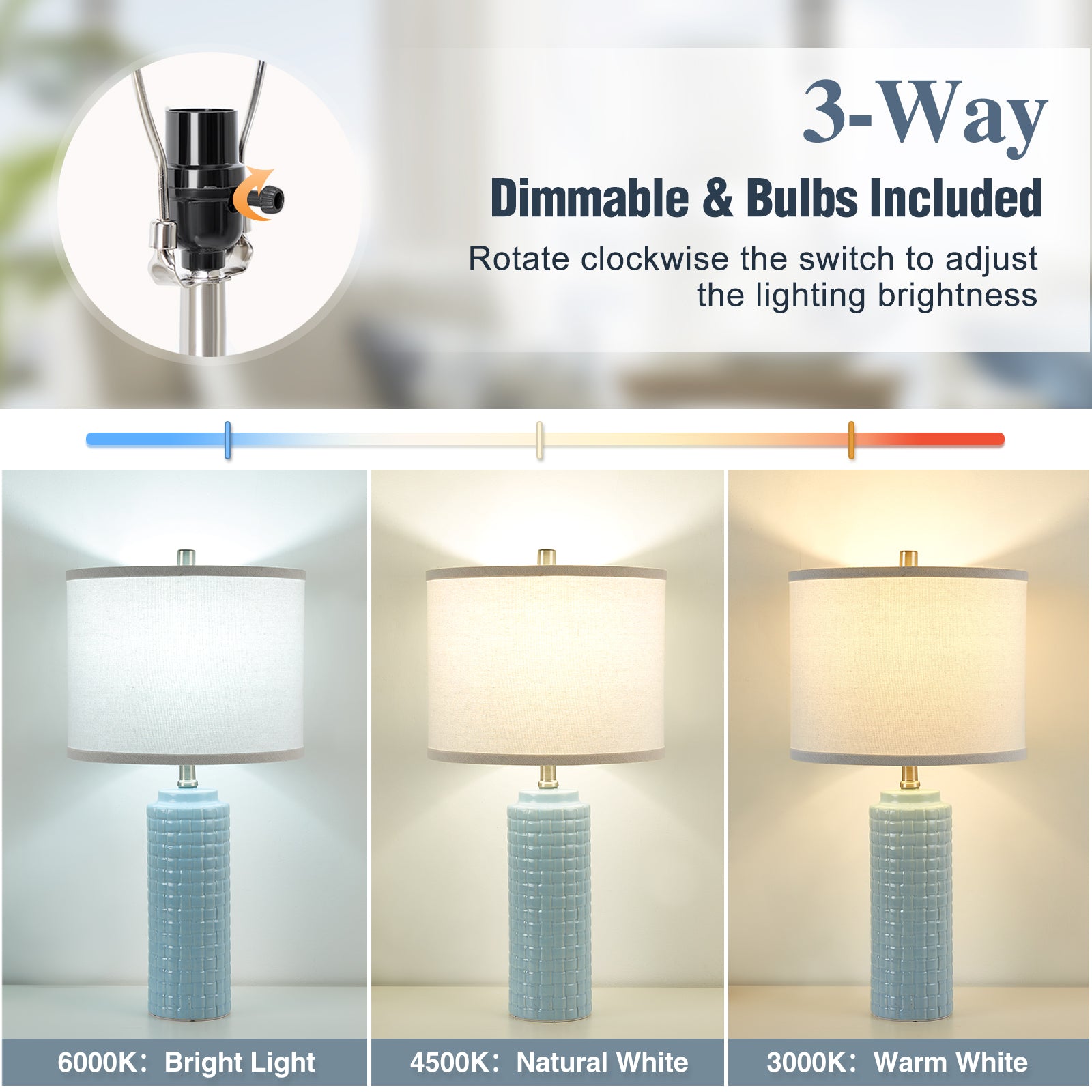 - 【3-Color Temperature Rotary Switch Control】The bedside lamps set of 2 offers 3 level brightness options (Warm White, Natural White, Daylight White). You can change the color temperature by rotary switch, greatly handy to operate. Proper high comfortable brightness for Reading/working/sleeping.