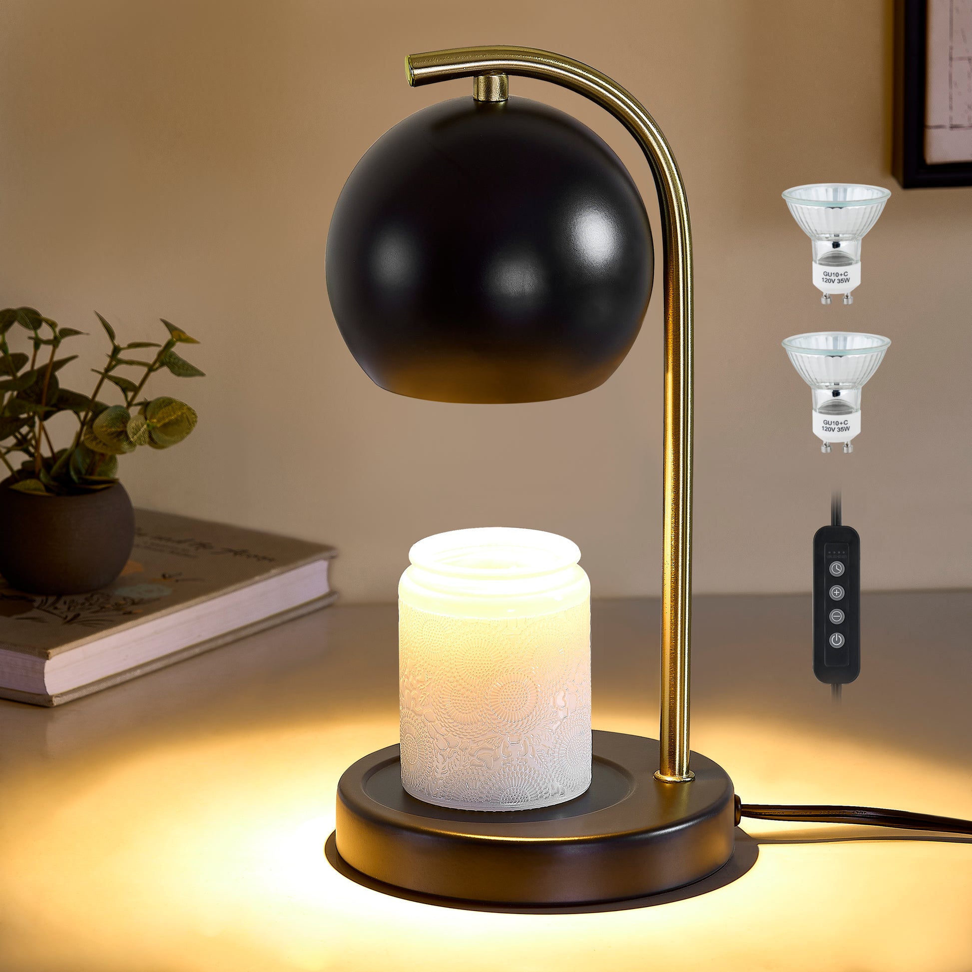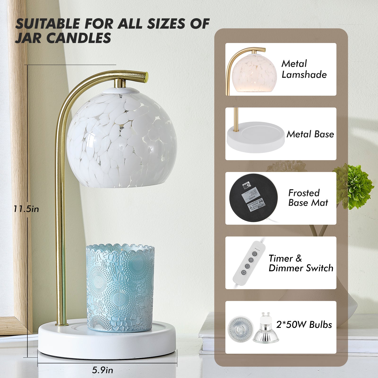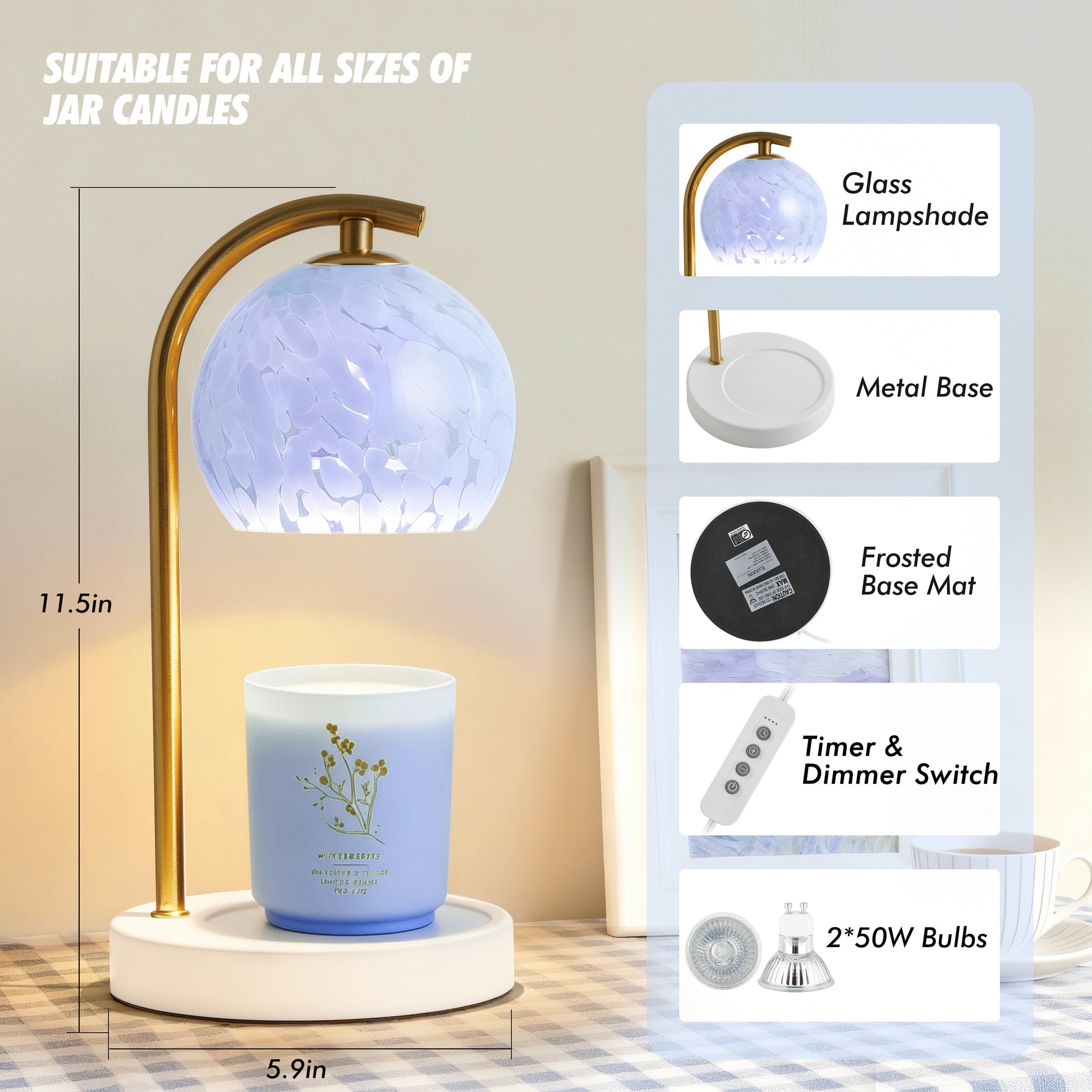 - Our candle melter lamp features a unique blend of the classic metal base, modern metal light body, and glass Lampshade design. Its timeless style not only elevates your decor but also adds sophistication to your space. 5.9x11.5inches height and the lamp candle warmer is designed with grooves on the base to fit most different types of jar candles or wax