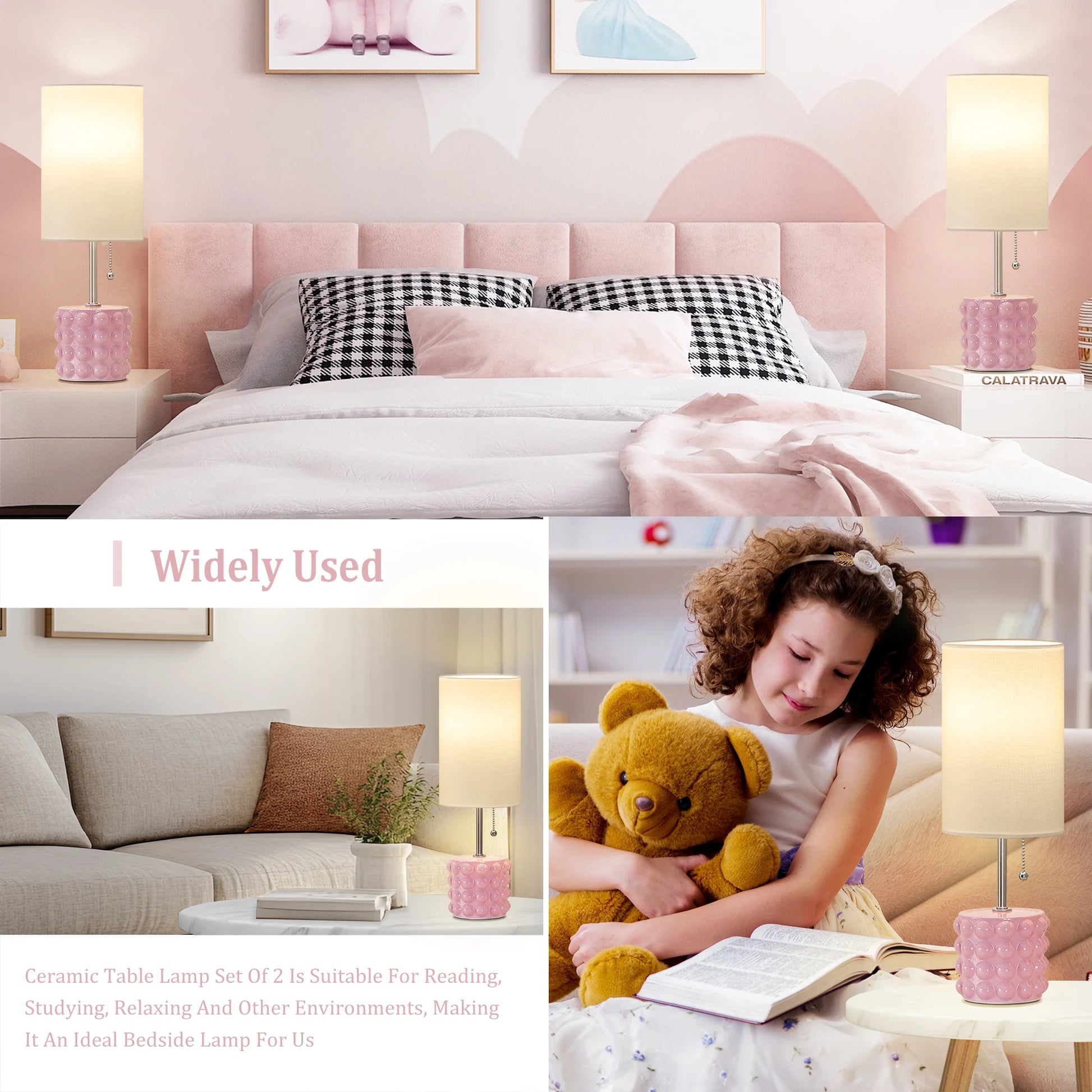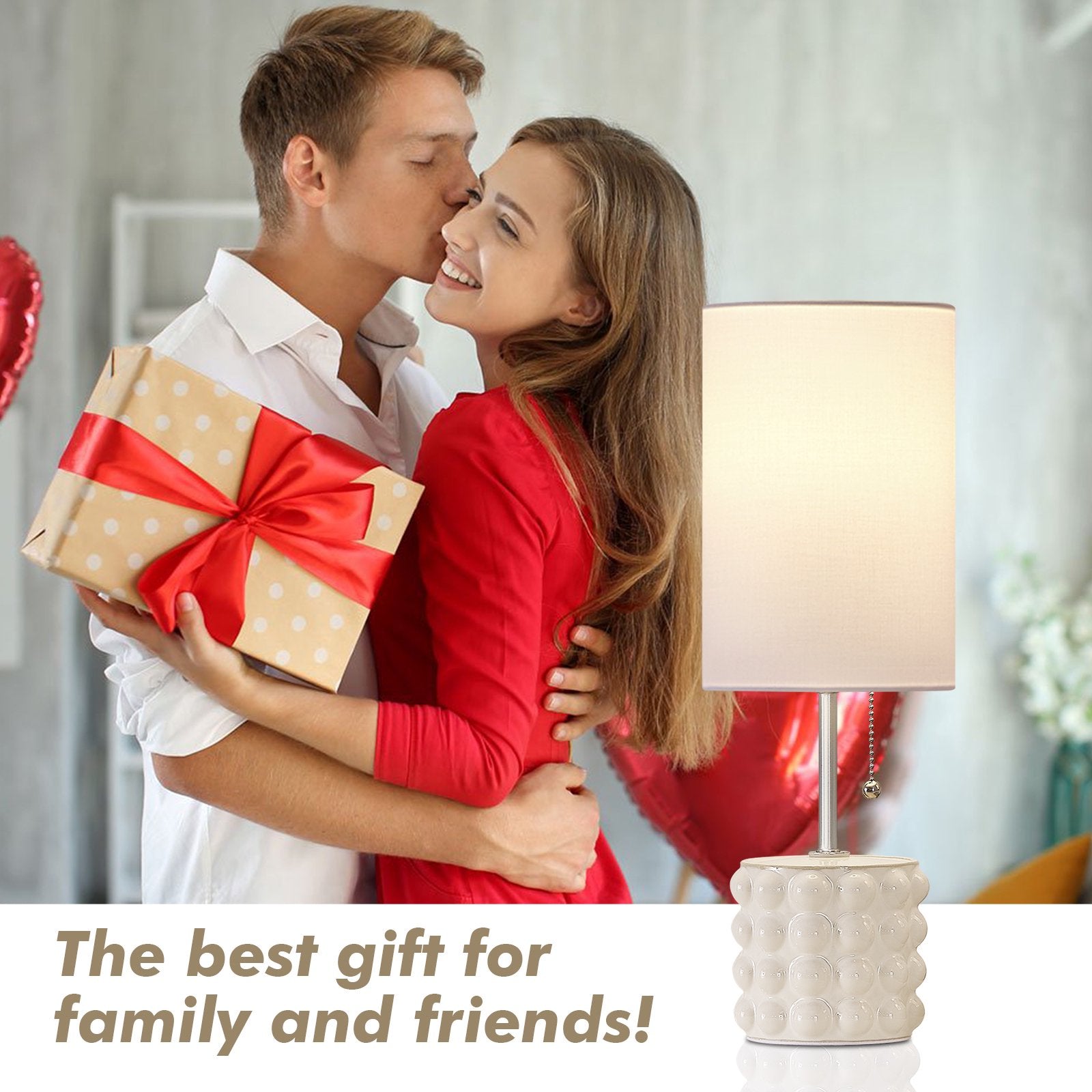 Crafted with a ceramic lamp body, and paired with drum-shaped White linen fabric shades,this set of 2 nightstand lamps showcases an elegant and modern style.Ideal for illuminating your bedroom or living room,they also serve as perfect decorative pieces to enhance your furniture sets.An ideal style to go with almost any decor; Fabric lampshade to soften the dazzling light; Ceramic lamp body to resistant corrosion and tarnishing