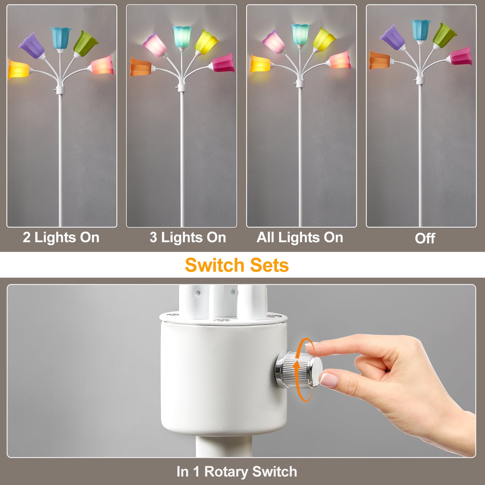 - 【Rotary Switch with 4 Settings】First rotation to turn on 2 lights, second rotation to turn on 3 lights. third rotation to turn on all lights, fourth rotation to turn off, which means not only you could alter the ray by fiddling the gooseneck arms, but also you can adjust brightness by turning on the number of light. A perfect night light or reading light for you.