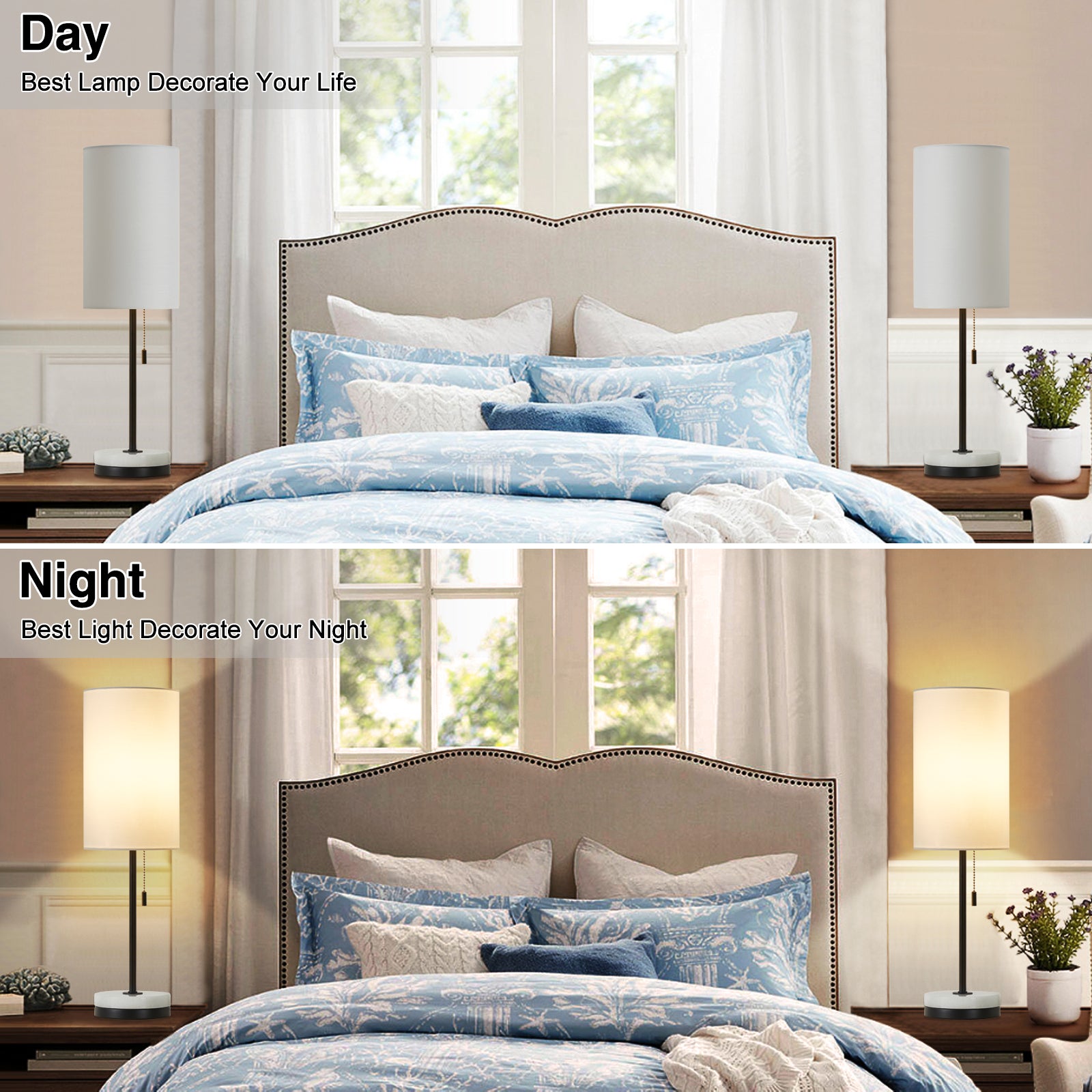 - 【Reading Lamp with Marble Base & Eye Caring Shade】 The night lamp with a high-quality Marble + Metal base which has an upgraded finish is anti-rust and corrosion-free. The heavy base can prevent it from tipping or wobbling and the thick pole design will hold the lamp shade steadily, with no shaking. Besides, the fabric shade makes the lamp spread relaxing, comfortable, evenly, and soft lighting, which creates a comforting ambiance to protect your eyes.