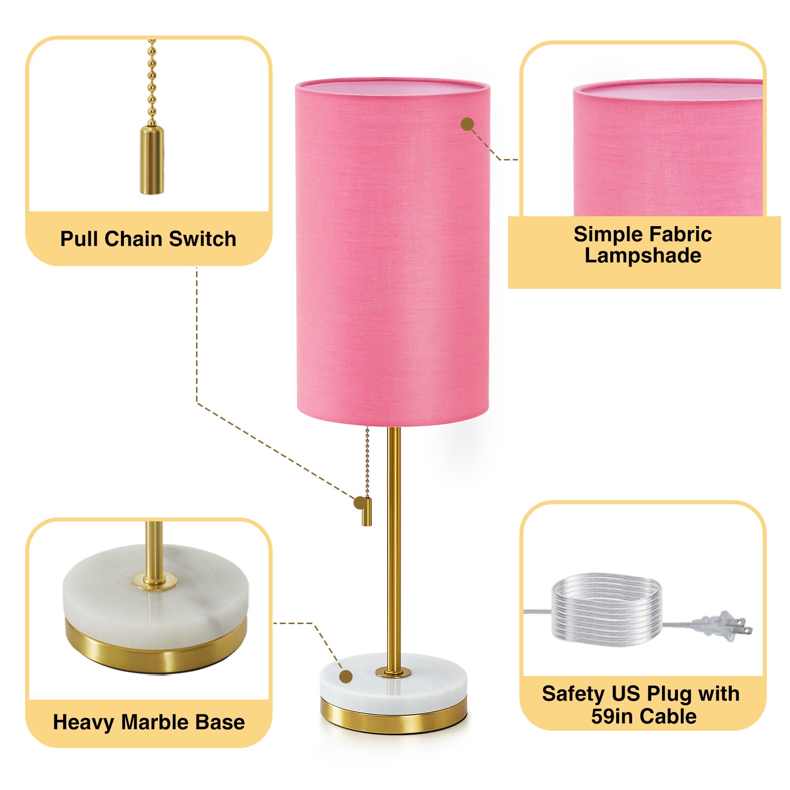 - Material: Metal Frame, Marble Base, Fabric Shade