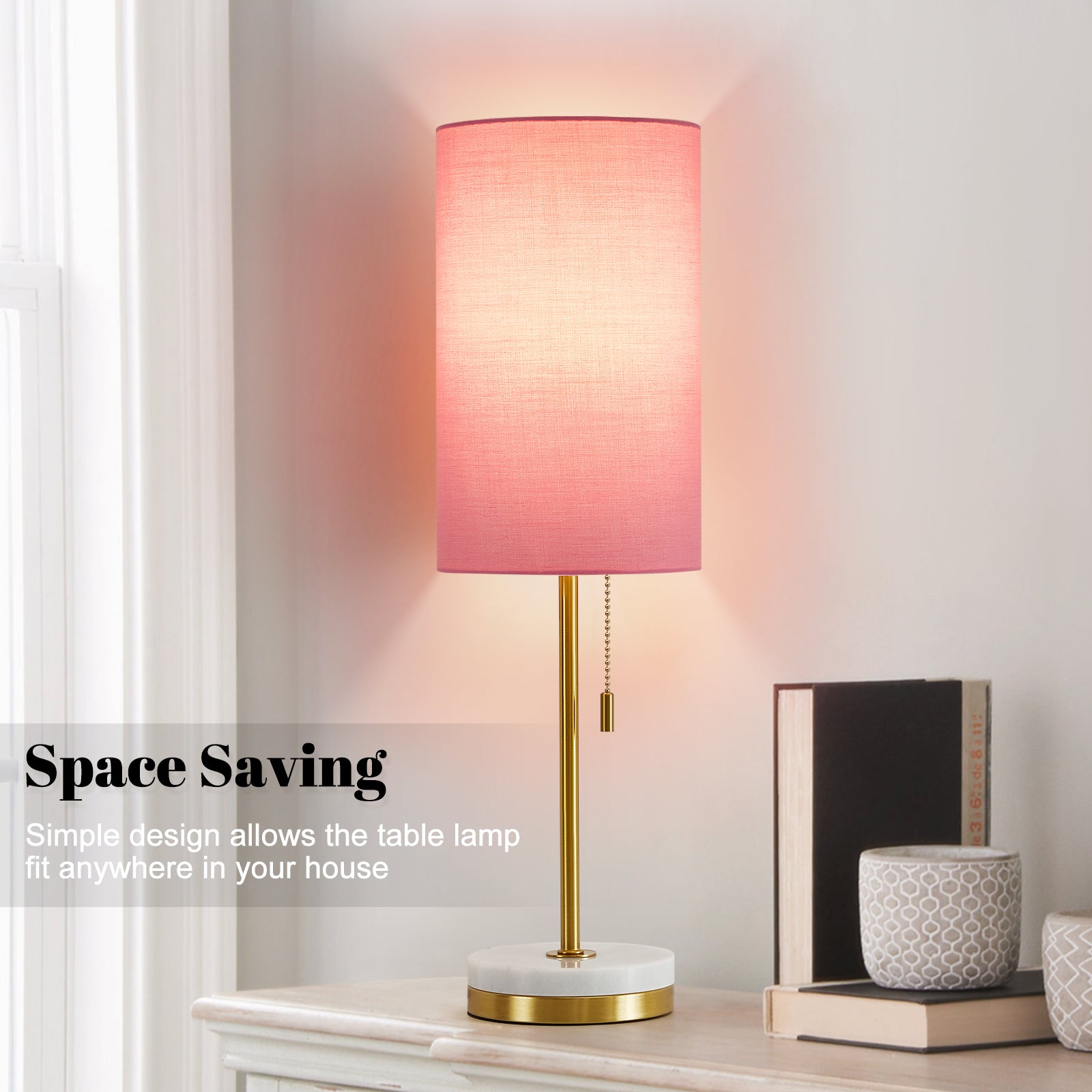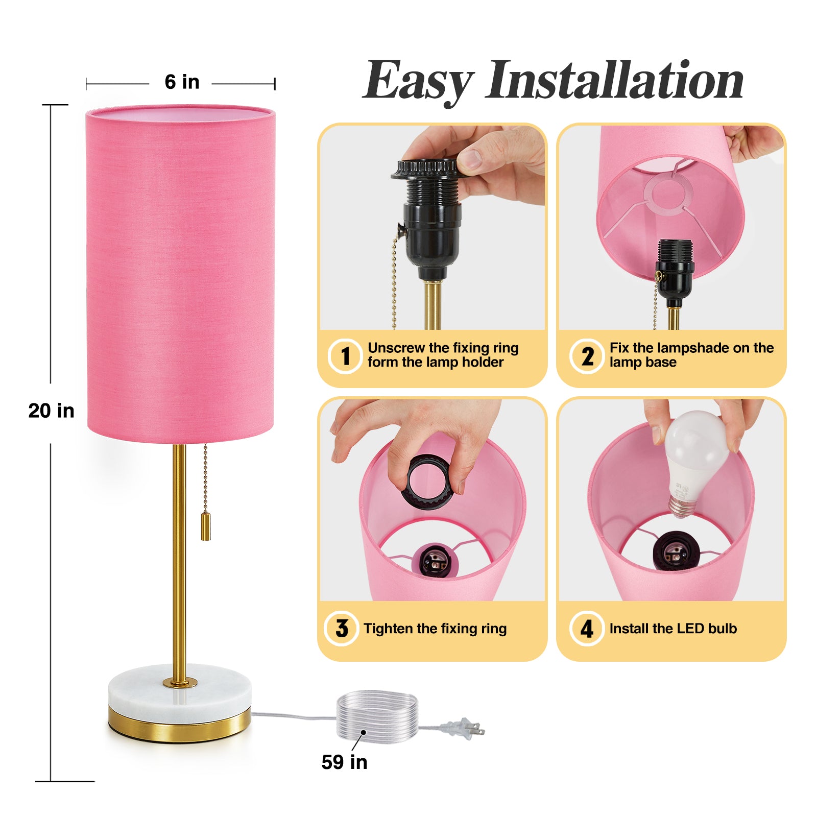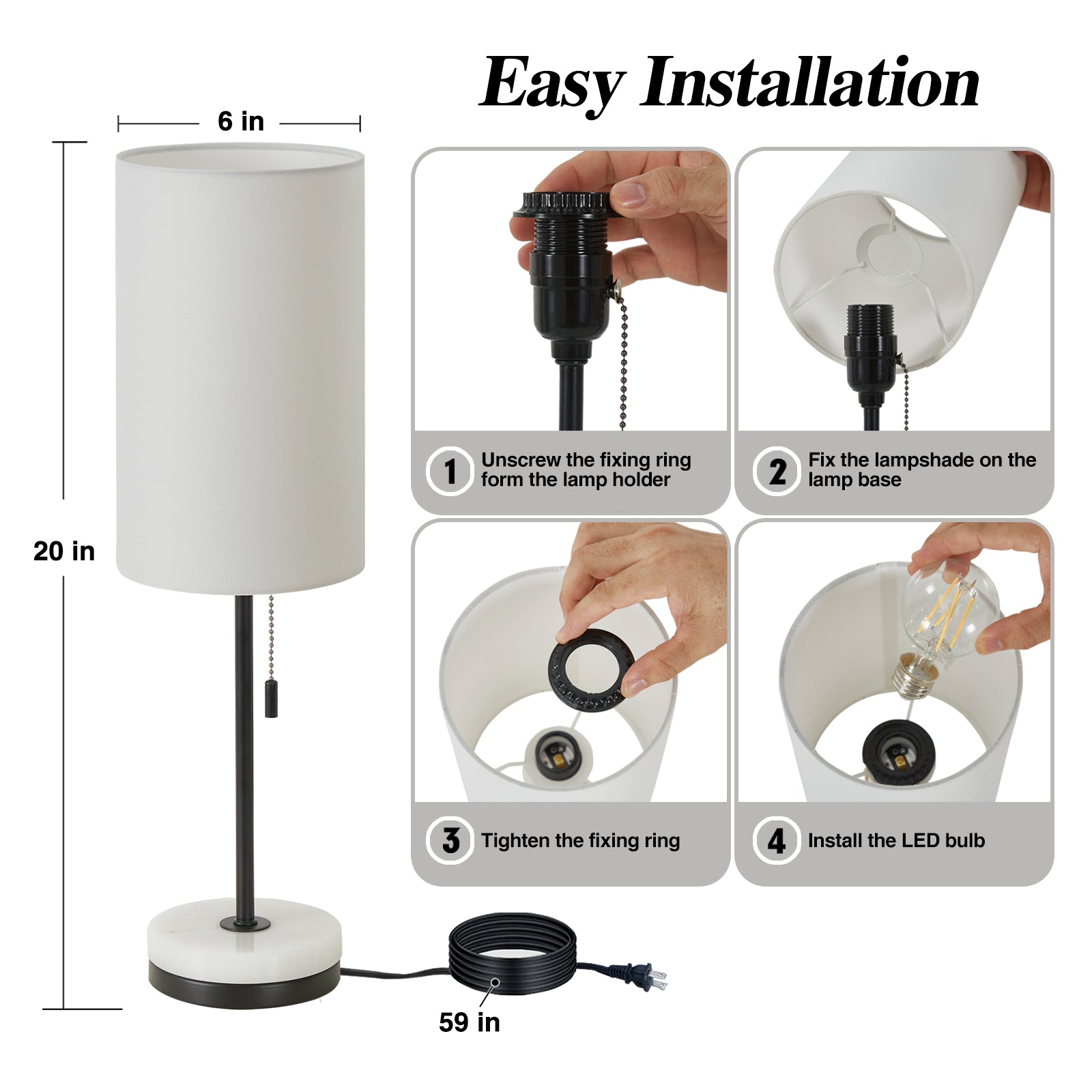 - Special Feature: Pull Chain, Marble Base, E26 Bulb Base, Corded, White Linen Lampshade, Eye Protection