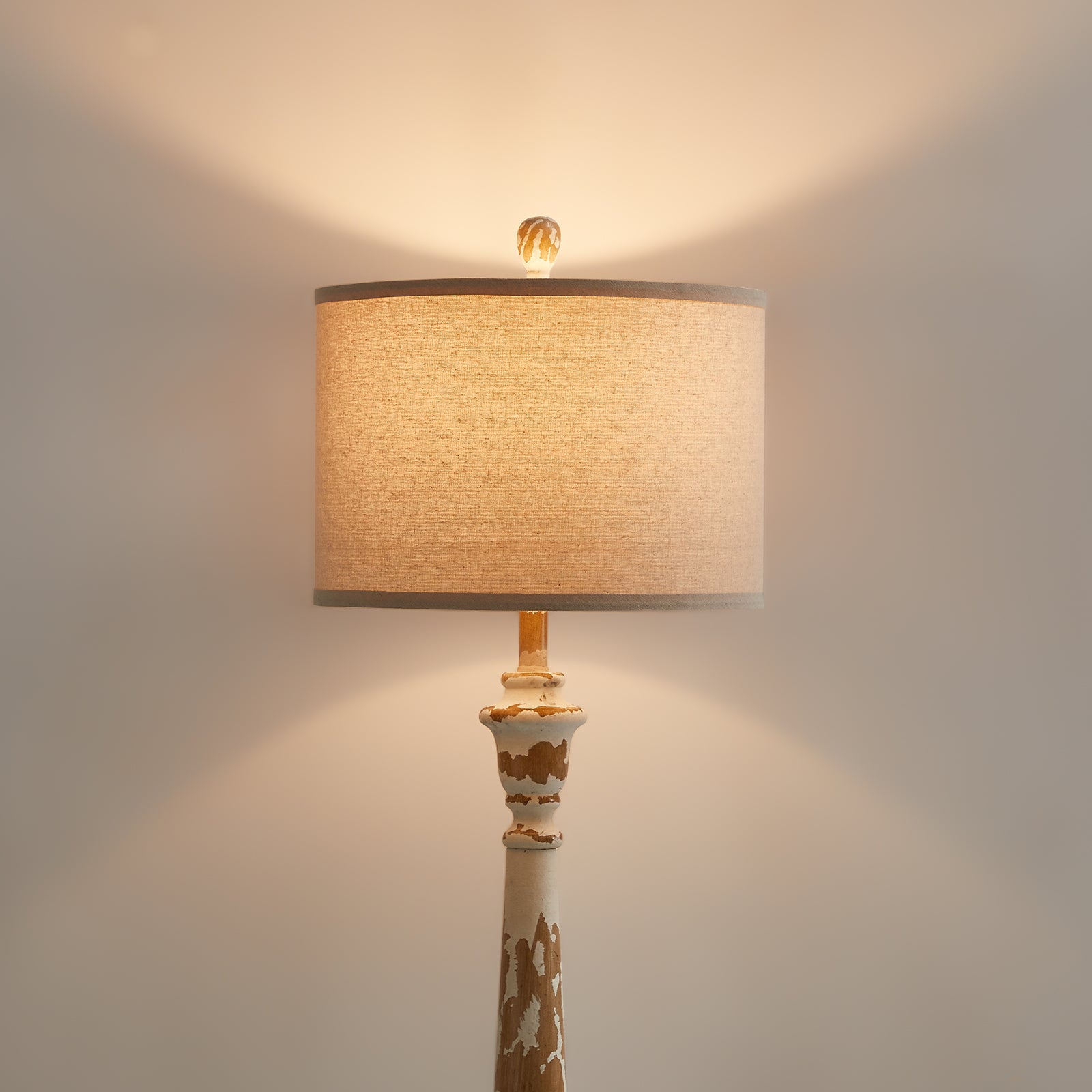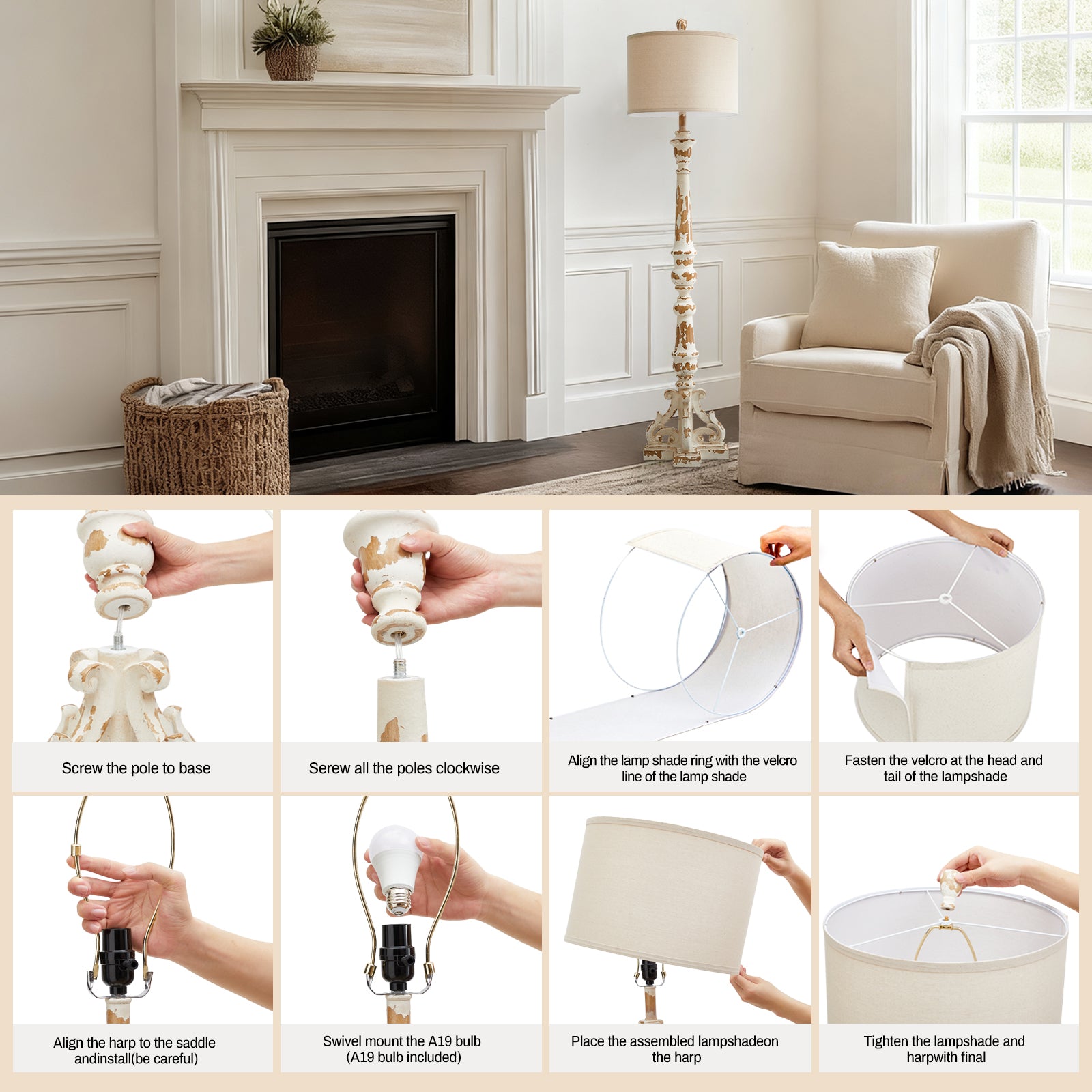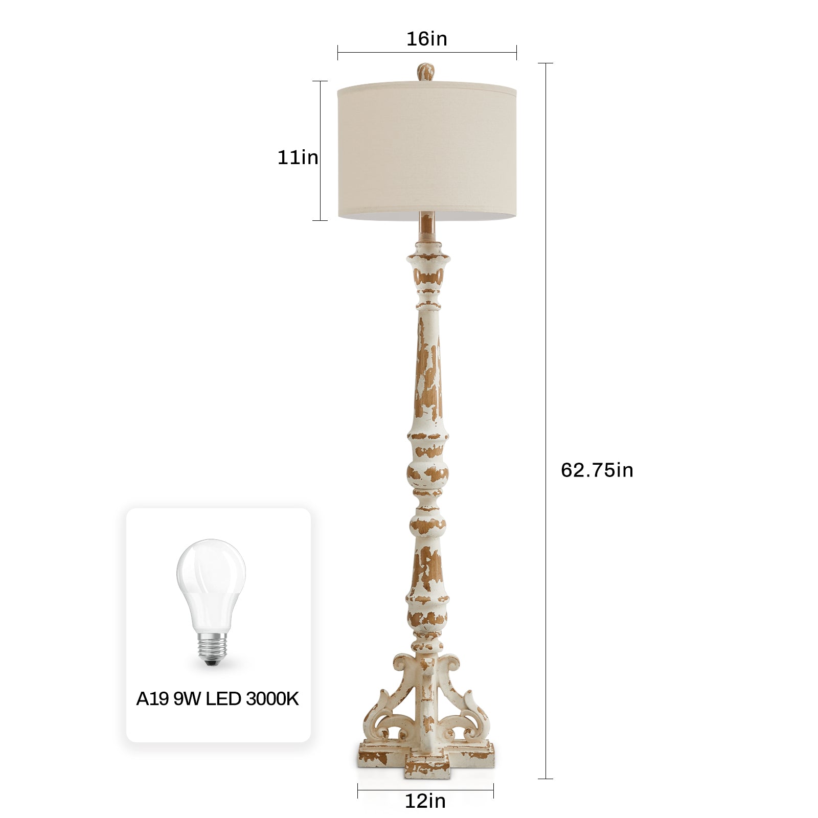 This modern style floor lamp features resin body details and natural linen lampshade, with an overall height of approximately 62.75 inches, suitable for indoor spaces such as living rooms and bedrooms. Equipped with 9W A19 LED bulb (3000K), supporting up to 100W, and easy to operate with a rotary switch. The three section lamp post can be flexibly assembled with a wire length exceeding 70.85 inches, making installation easy and ready to use.