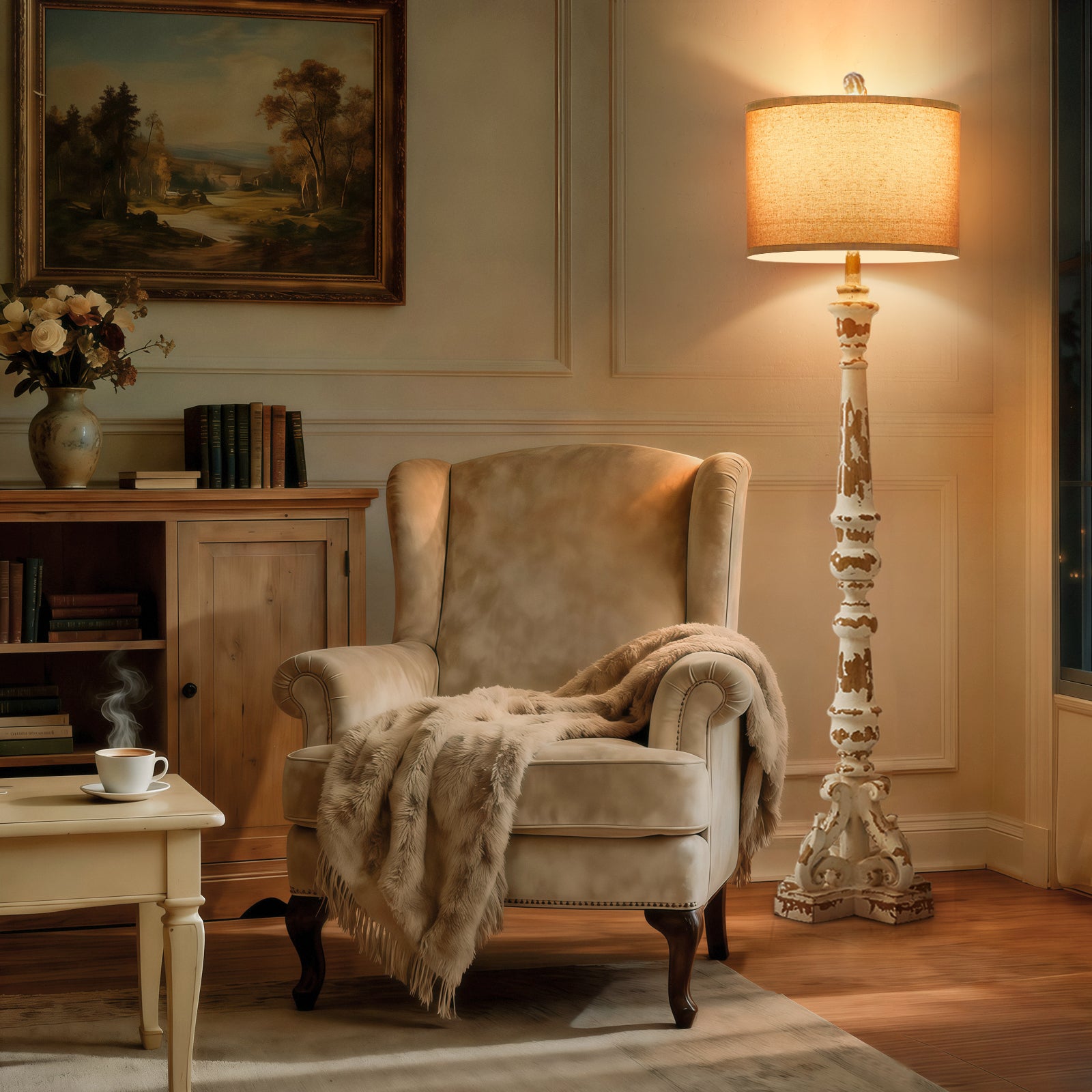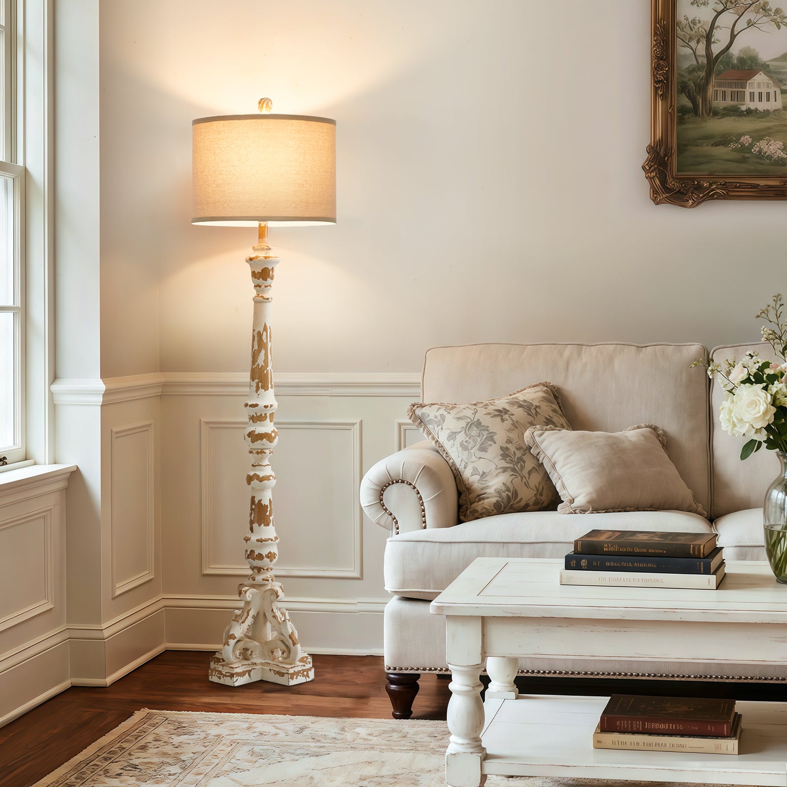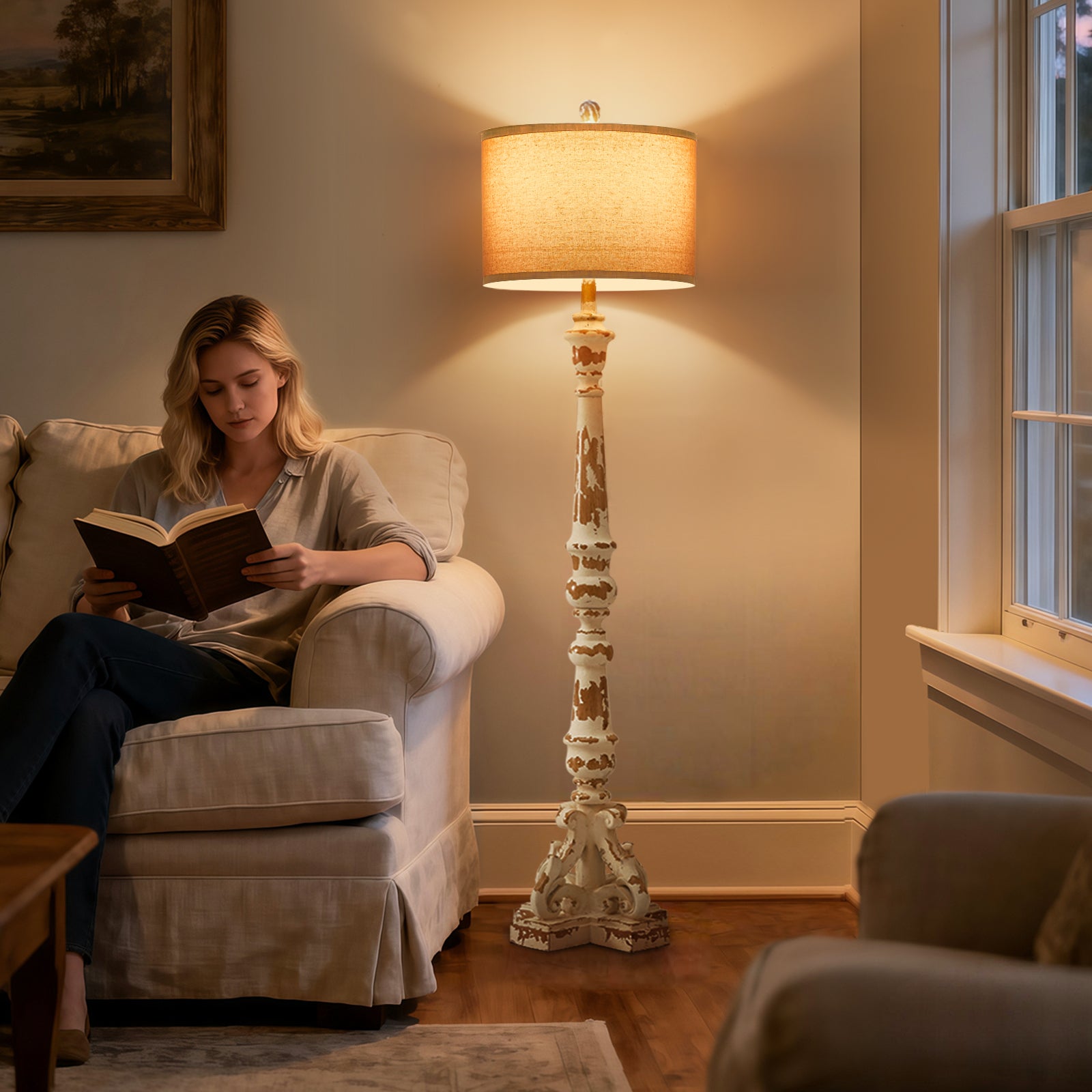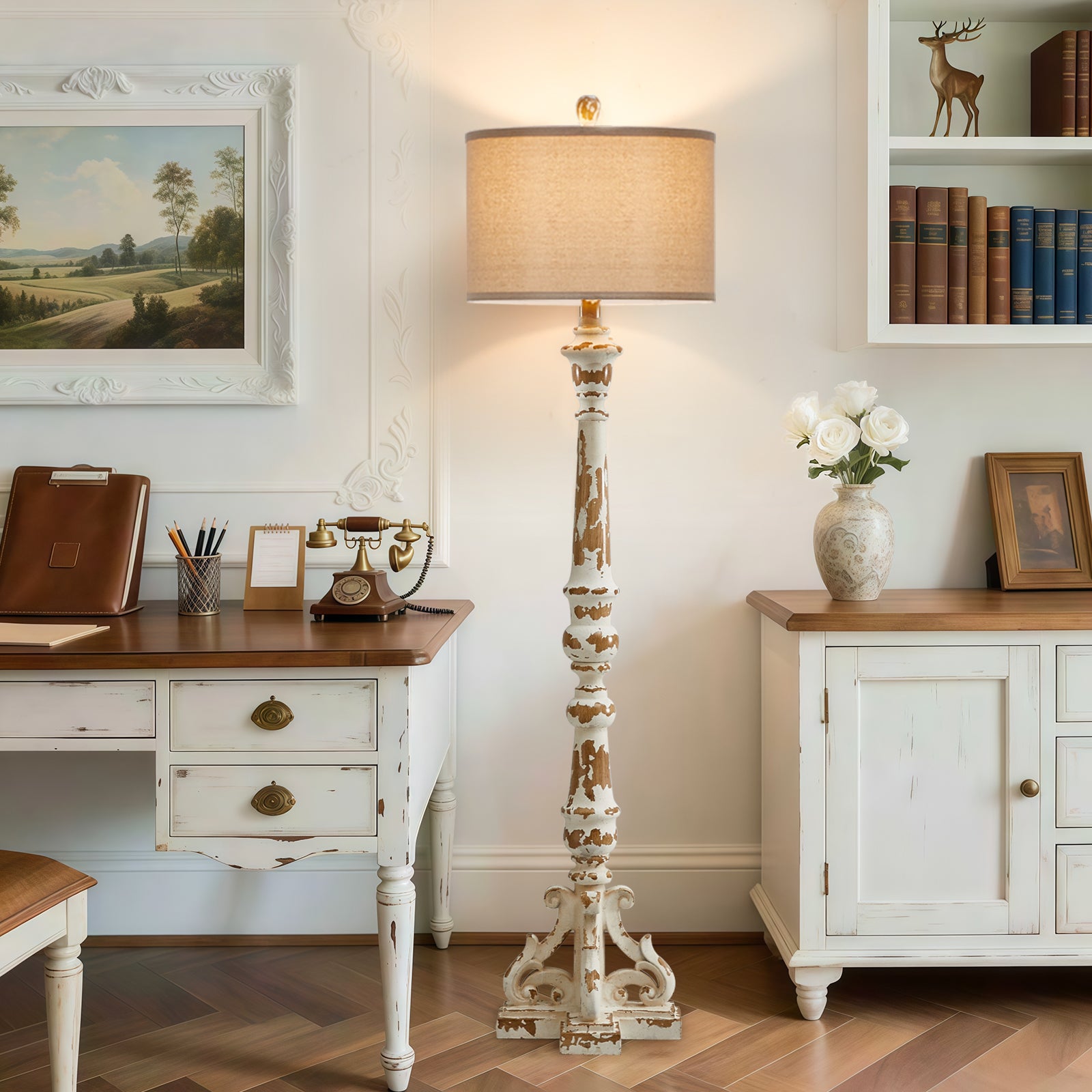 This modern style floor lamp features resin body details and natural linen lampshade, with an overall height of approximately 62.75 inches, suitable for indoor spaces such as living rooms and bedrooms. Equipped with 9W A19 LED bulb (3000K), supporting up to 100W, and easy to operate with a rotary switch. The three section lamp post can be flexibly assembled with a wire length exceeding 70.85 inches, making installation easy and ready to use.