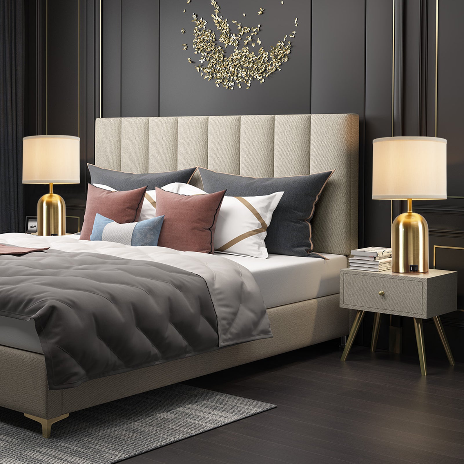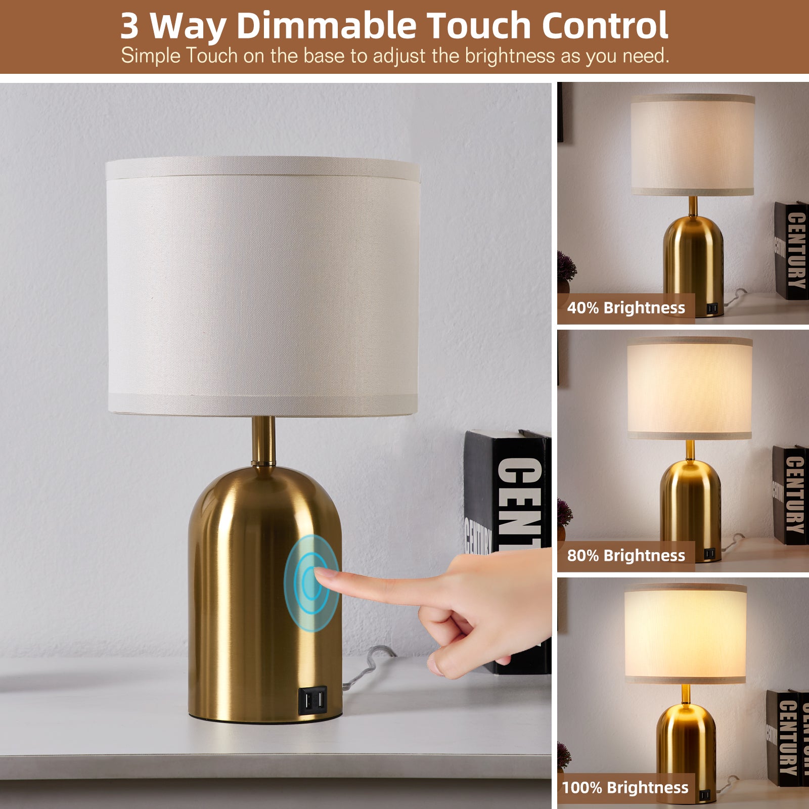 - 【3-Way Dimmable Touch Bedside Lamps Set of 2】The dimmable lamp has 3 levels of brightness. (Low, Medium, High), so you don't have to fumble around for a switch in the middle of the night.Just tap anywhere of the black metal base part of the nightstand lamps to switch settings from low to bright.
